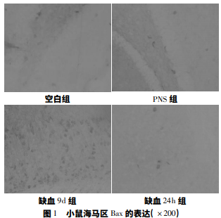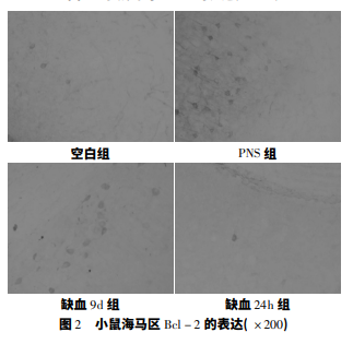 各組小鼠海馬區 Bax、Bcl - 2 表達水平比較: 與空白組比 較,缺血 9d 組 Bcl - 2、Bax 水平均明顯增高; 與缺血 9d 組比 較,PNS 組 Bax 的表達水平明顯降低,Bcl - 2 /Bax 的表達水平 明顯增高; 缺血9d 組 Bax 和 Bcl - 2 的表達均較缺血24h 組增 高; 差異均具有統計學意義。( 見圖 1、圖 2) 表 1 各組小鼠海馬區 Bax、Bcl - 2 水平比較( x ± s,個) 組別 只數 Bcl - 2 Bax Bcl - 2 /Bax 空白組 7 2. 94 ± 2. 15 4. 00 ± 4. 10 0. 92 ± 0. 52 PNS 組 8 7. 30 ± 3. 75 3. 35 ± 1. 81 2. 26 ± 0. 70cd 缺血 9d 組 9 27. 44 ± 19. 59abd 63. 44 ± 12. 77abd 0. 46 ± 0. 32 缺血 24h 組 9 0. 58 ± 0. 88 1. 58 ± 1. 44 0. 61 ± 1. 11 注: 與空白組比較,a P < 0. 05; 與 PNS 組比較,b P < 0. 05; 與缺血9d 組比較,c P <0. 05; 與缺血24h 組比較,c P <0. 05。