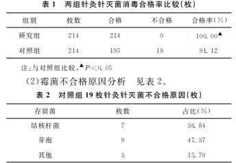 根據細菌培養結果,比較兩組針灸針 滅菌合格情況,分析針灸針消毒不合格的原因。