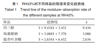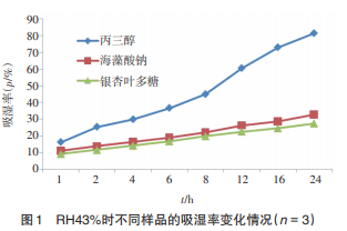 于室溫(25 ± 1)℃,將飽 和醋酸鉀溶液、飽和碳酸鉀溶液和飽和硫酸銨溶 液分別放入干燥器內,控制相對濕度(RH)為 43%、60%、81%。準確稱取3份銀杏葉多糖、丙 三醇、海藻酸鈉,1.0 g/份,加入到直徑3 cm的稱 量瓶中,再分別放置于以上干燥器內,于 1、2、 4、8、12、16、24 h等不同時間點,測定樣品放置 前、后的質量(m0、mn),計算吸濕率: 吸濕率 (%)= 100(mn - m0)/ m0。同時,以吸濕率為縱坐 標、時間為橫坐標,繪制變化曲線,計算其趨勢 線斜率k,即為樣品的吸濕速率。 RH43%的環境中,各樣品在0 ~ 24 h內的吸濕 率高低依次為丙三醇>海藻酸鈉>銀杏葉多糖, 在24 h的吸濕率分別為81.2%、32.8%、27.5%。其 中,丙三醇的吸濕率上升速度最快(k = 9.434),而 海藻酸鈉(k = 3.088)與銀杏葉多糖(k = 2.634)則是 緩慢上升,且較為接近。吸濕率變化見圖1,趨勢 線見表1。