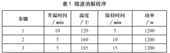 分別精密稱取0.3g北沙參及莖葉樣品,置于聚四氟乙烯消 解罐中,加入 6.0mL HNO3和 2.0mL 30%H2O2,置通風(fēng)櫥中靜置 過(guò)夜。密閉消解罐,按表1微波消解程序進(jìn)行消解;消解完畢, 待冷卻至室溫后,打開(kāi)消解罐,將消解后的樣品溶液在電熱板 130℃上加熱趕酸至1~2mL左右,冷卻后用超純水清洗內(nèi)罐轉(zhuǎn) 移定容至25ml量瓶中,待測(cè)。同時(shí)做試劑空白試驗(yàn)。
