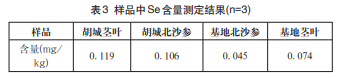 按照“1.2.1”項(xiàng)下方法處理樣品,按“1.2.2”項(xiàng)下檢測(cè)方法進(jìn)行測(cè)定,每個(gè)樣品重復(fù)測(cè)定 3 次。結(jié)果見(jiàn)表3。由表3可知,北沙參莖葉中Se的含量均高于根中的含量 。