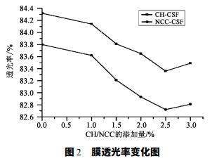 從圖 2 可知,不添加殼聚糖時 CH-CSF 的 透光率為 84. 32% 。當(dāng)殼聚糖添加量為 2. 5% 時,CH-CSF 的透光率為 83. 36% ,透光率隨殼 聚糖添加量的增加呈下降趨勢。這是因為殼聚 糖濃度過高增加了結(jié)晶區(qū)的混亂度,光線不能 直接通過結(jié)晶區(qū),導(dǎo)致含有高濃度的殼聚糖淀 粉膜的透光率降低。岳曉華在研究殼聚 糖淀粉膜時發(fā)現(xiàn)隨著淀粉比例的增加膜的透光 性降低。我們的實(shí)驗中,淀粉含量是一定的,加 入殼聚糖后,膜的透光率降低,表明殼聚糖對降低膜的透光率具有一定的作用。 纖維素納米晶添加量為 2. 5% 時,透光率為 82. 72% ,比不添加纖維素納米晶的 CH-CSF 低 0. 64% 。 這是因為額外添加的纖維素納米晶結(jié)晶度高,且與殼聚糖產(chǎn)生靜電作用,導(dǎo)致 NCC-CSF 比 CH-CSF 的 透光率低。此結(jié)果與徐彬飛等研究結(jié)果一致。