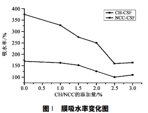殼聚糖濃度的增加會減少淀粉中親水基團(tuán)的含量,隨著殼聚糖含量增加,淀粉膜的吸水率逐漸 降低,由圖 1 可知,不添加殼聚糖時,吸水率為 374. 8% ,當(dāng)殼聚糖的添加量為 2. 5% 時,CH-CSF 的吸水 率達(dá)到最低,為 159. 2% 。此結(jié)果表明殼聚糖的加入能降低膜的吸水率,殼聚糖含量為 2. 5% 時,效果最 佳。 圖 1 膜吸水率變化圖 由圖 1 可知,NCC-CSF 的吸水率隨著纖維 素納米晶添加量的增加呈現(xiàn)下降的趨勢,未添 加時,CH-CSF 的吸水率為 169. 7% 。當(dāng)纖維素 納米晶添加量為 2. 5% 時,其吸水率最低,為 99. 8% 。這是因為纖維素納米晶增加了殼聚 糖基膜的彎曲度,減弱了殼聚糖的親水性,導(dǎo) 致水 的 滲 透 率 降 低,從而改善了膜的耐水 性。因此,纖維素納米晶的添加可在一定程 度上降低淀粉基膜的吸水性。Chen 等的研 究發(fā)現(xiàn)用纖維素納米晶制備的復(fù)合膜可降低 材料的親水性。由此可見,纖維素納米晶在降 圖 2 膜透光率變化圖 低膜的吸水性方面具有良好作用。