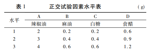 在單因素試驗的基礎上, 主料蔬菜 50 g,醬油 20 g、香油 0. 2 g、蠔油 0. 1 g、 料酒 0. 1 g 固定的前提下,選擇辣椒油、麻油、白 糖、食醋的添加量為調味配方的主要影響因素,以 感官評分為評價指標,選用L9 ( 34 ) 正交表,進行 4 因素 3 水平正交試驗( 表 1) 。