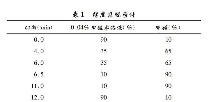 色譜柱 ACQUITY UPLC BEH C18 2. 1 mm × 100 mm,1. 7 μm Column,流動相: A: 0. 04% 甲 酸 水 溶 液,B: 甲 醇,洗脫梯度程序件 表 1。流速: 0. 20 ml /min; 柱溫: 40 ℃ ; 進樣量: 10 μl。 電噴霧離子源( ESI,正離子掃描; 掃描方式,多反應監 測 MRM) 。氣 簾 氣 ( CUR) ,35 psi; 霧化 氣 ( GS1 ) , 50 psi; 輔助氣( GS2) ,50 psi; 電噴霧電壓( IS) ,5 500 V; 碰撞氣( CAD) ,medium; 離子源溫度( TEM) ,550. 0 ℃。 特征離子見表 2。