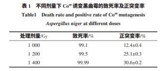 由于此前黑曲霉 zs-10 是經(jīng)過(guò) γ 射線(Co60)誘變 后篩選得到的菌株,因此采用高劑量 γ 射線(Co60)進(jìn) 行孢子懸浮液誘變,選用 γ 射線(Co60)處理的劑量分別 為 1 000、1 200、1 400 Gy,其致死率與正突變率見(jiàn)表 1。