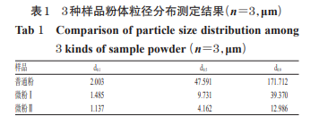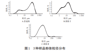 分別稱(chēng)取“2.1”項(xiàng)下 3 種樣品約 1 g,采用激光粒度 分析儀測(cè)定其粒徑,平行測(cè)定3次,取平均值,結(jié)果見(jiàn)表 1(d0.1、d0.5、d0.9分別表示小于某粒徑的微粒在全微粒群中 的質(zhì)量分?jǐn)?shù)為10%、50%、90%),其粉體粒徑分布見(jiàn)圖 1。由表1、圖1可見(jiàn),牡蠣殼經(jīng)過(guò)超微粉碎后,微粉Ⅰ和 微粉Ⅱ的d0.1、d0.5、d0.9顯著小于普通粉,且粒徑分布趨于 均勻,大部分微粉Ⅱ粒徑達(dá)到了超微粉體粒徑不得超過(guò)10 μm的要求 。