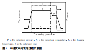 實驗前,將 PLA 與 PBS 置于真空干燥箱( 上海博迅BZF-30真空干燥箱) 中,在 80 ℃ 的真空環境下干燥 5 h以去除原料中的水分。然后按照 PBS 質量分數分別為 10% 、20% 、30% 的組成配比,在雙螺桿擠出機( TE-35,中國 江蘇南京科亞公司) 上擠出,物料經口模擠出后,用冷卻水槽 冷卻,之后用高壓空氣吹干切粒。雙螺桿擠出機加工溫度分 布從加料口到機頭段分別設定為 160 ℃—165 ℃—170 ℃— 180 ℃—185 ℃—185 ℃—180 ℃—170 ℃,螺桿轉速 40 r/ min,喂料轉速 6 r/min。為了保證所有組分的物料經歷相同 的熱歷程,純 PLA 和 PBS 也利用雙螺桿擠出機擠出造粒。 經雙螺桿擠出造粒的 PLA/PBS 共混物在 80 ℃的電熱恒 溫鼓風干燥箱( DHG-9420A,上海一恒科學儀器有限公司) 干 燥 6 h,以去除水分。利用平板硫化機( KS100HR,東莞市科 盛實業有限公司) 在 180 ℃、10 MPa 的條件下熱壓制備 1 mm 厚的板材,并將其裁剪成 10 mm×10 mm×1 mm 的小片材用于 自制高壓釜間歇發泡。發泡工藝過程如圖 1 所示: 首先,高 壓釜在5 min內升溫至浸泡溫度( Ts,150 ℃ ) ,利用流體輸送 泵( 2ZB-2L20,北京衛星制造廠) 向釜內通入低壓 CO2 氣體 3 min以排除釜內空氣,隨后關閉卸壓閥并將釜內氣體壓力升 至浸泡壓力( Ps,16 MPa) ,此時 CO2 處于超臨界狀態并向PLA/PBS 共混物中擴散,維持浸泡時間( ts,1 h) 之后,降低釜 內溫度至發泡溫度( Tf,90 ℃、100 ℃、110 ℃ ) 并維持釜內壓 力不變。在各發泡溫度的條件下繼續浸泡 20 min,達到 CO2 飽和狀態后,通過球形卸壓閥將釜內壓力快速( 0. 5 s 內) 卸 壓至大氣壓,然后迅速通入冷卻水定型。