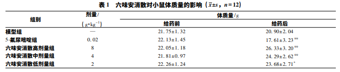 表 1 顯示,給藥前 各組小鼠體質(zhì)量差異無(wú)統(tǒng)計(jì)學(xué)意義 ( P> 0. 05) ; 給藥后, 與模型組比較,5-氟尿嘧啶組小鼠體質(zhì)量顯著下降,而六 味安消散組顯著增加 ( P<0. 05,P<0. 01) 。此外,模型組、 5-氟尿嘧啶組小鼠毛發(fā)暗淡,食欲不佳,精神萎靡; 六味 安消散組小鼠毛發(fā)光澤,食欲佳,精神良好。
