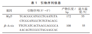 試驗所用引物均根據(jù) GenBank Myf5 基因?qū)?yīng)(登錄號:17877)的小鼠序 列,采用 Premier 5.0 軟件進行實時熒光 PCR 引物 設(shè)計,由北京華大公司合成(表 1)。