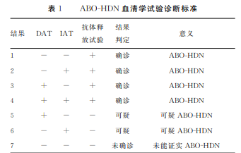 ABO-HDN 的診斷包括以下幾點: 母嬰血型不同、DAT、IAT 和抗體釋放試驗的結果。 以抗體釋放試驗陽性為診斷標準,結合新生兒血紅蛋 白、膽 紅 素 水 平 等 臨 床 數 據 及 其 臨 床 癥 狀 來 診 斷 ABO-HDN。見表1。