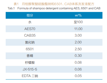 洗發液樣品按照配方表中原料先后順序投料,待表面 活性劑完全溶解后,將體系pH值調節為4.0~8.5,再加入氯化 鈉、香精等攪勻即可。