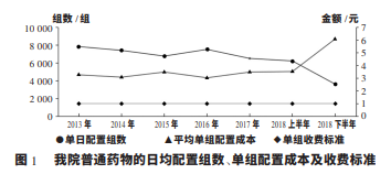 普通藥物日均配置組數、單組配置成本及收費標準 我院普通藥物的平均配置工作量為 6 529 組 /日, 平均單組配置成本為 3. 69 元 /組,收費標準為 1 元 /組。 其中,2013 年的平均配置組數最高,達 7 804 組 /日; 2018 年下半年的平均配置組數最低,僅為 3 607 組。 2016 年的單組配置成本最低,僅為 3. 02 元 /組; 2018 年 下半年的單組配置成本最高,達 6. 06 元 /組。由圖 1 可見, 隨著單日配置組數的下降,分攤后單組配置成本逐年上 升,但收費標準一直不變,且遠低于醫院的日常運行成本。我院抗菌藥物的平均配置工作量為 1 230 組 /日, 平均單組配置成本為 4. 82 元 /組,收費標準為 2 元 /組。 其中,2013 年的平均配置組數最高,達 1 749 組 /日; 單 組配置成本最低,僅為 3. 29 元 /組。2018 年下半年的平 均配置組數最低,僅為 964 組 /日; 單組配置成本最高, 達 5. 97 元 /組。由圖 2 可知,單日配置組數與分攤后單 組配置成本呈負相關,單日配置工作量越小,單組配置 成本越高。同時,收費標準一直遠低于醫院的日常運行 成本,成本與收益間的差距不斷擴大。