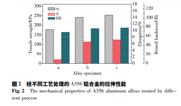 ( 1) 與常規(guī)復(fù)合細(xì)化變質(zhì) A356 鋁合金相比,在真空感應(yīng) 電磁懸浮熔煉細(xì)化變質(zhì)工藝條件下,A356 鋁合金的抗拉強(qiáng) 度、伸長率及布氏硬度分別提高了 4. 82%、9. 48%、1. 94%,可 見其力學(xué)性能明顯提高,尤其是塑性。