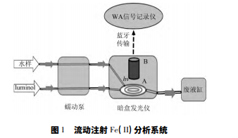 Fe( II) 分析系統(tǒng)由蠕動泵( Ismatec,瑞士) 、暗 盒 式 化 學(xué) 發(fā) 光 儀 ( waterville analytical,WA ) 、 “WA”軟件信號接收儀( 計算機(jī)) 和樣品管組成。 樣品管將試劑及樣品瓶、蠕動泵、暗盒發(fā)光儀、廢 液缸連接起來( 圖 1) 。WA 發(fā)光儀密閉不透光, 內(nèi)部由樣品混合池( A) 和正對混合池的光電倍增 管( photomultiplier tube,PMT) ( B) 組成。測定時, 海水樣品和 luminol 試劑按 1∶ 1 的體積比分別流 入混合池后反應(yīng)發(fā)光,由正上方 PMT 檢測光信號 并發(fā)射藍(lán)牙信號,隨后被計算機(jī)接收并記錄。樣 品流速、積分時間、數(shù)據(jù)點(diǎn)頻率等參數(shù)通過蠕動泵 開關(guān)及“WA”軟件進(jìn)行設(shè)置。