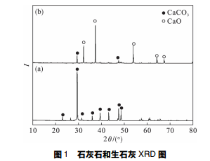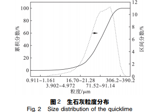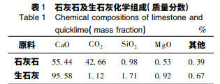 原料: 本實驗所用的石灰石為遼寧省某地所 產,磨樣機磨細后經馬弗爐 1 050 ℃煅燒 2 h 后隨 爐冷卻,石灰石成分及煅燒后的生石灰的成分見 表 1,XRD 圖譜見圖 1,生石灰的粒度分布如圖 2 所示.