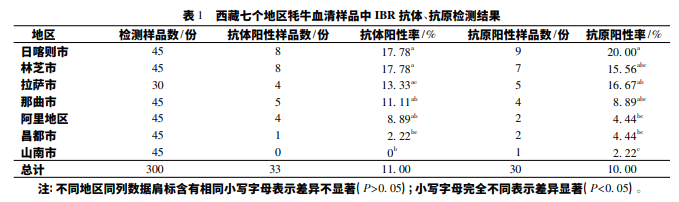 西藏七個地區牦牛血清樣品中 IBR 抗體、抗原 檢測結果見表 1。