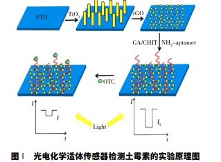 光電化學適體傳感器檢測土霉素的實驗原理如圖 1 所示。實驗采用 FTO 導電玻璃為基底,在其表 面制備了 TiO2 /石墨烯復合材料,通過滴涂殼聚糖溶液,使電極表面帶上氨基,通過戊二醛交聯,使氨 基標記的土霉素適配體牢固地修飾至電極表面。采用電化學工作站檢測修飾了土霉素適配體的光電流, 此時得到的光電流為 I0。將修飾電極用于某一濃度的土霉素溶液測定時,土霉素與其適配體發生特異 性結合形成復合物,測得光電流值為 I。由于目標物與適配體的特異性結合,阻礙了光電傳感界面對光 的有效吸收及光生電子的轉移,從而導致光電流減小,其信號值用 ΔI 表示,ΔI = I0 - I。基于電流的變 化值與待測物土霉素的濃度成正比,從而實現土霉素的測定。