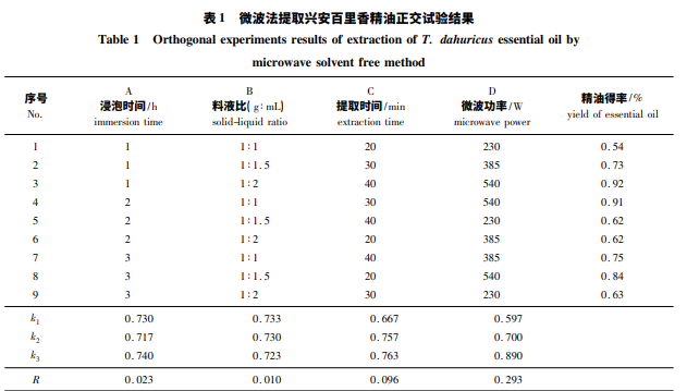 為了確定微波法最佳提取工藝條件,以浸泡時間( 1、2 和 3 h) 、料液比( 1 ∶ 1、1 ∶ 1. 5 和 1 ∶ 2,g ∶ mL) 、提取時間( 20、30 和 40 min) 和微波功率( 230、385 和 540 W) 4 個因素,采用 L9 ( 34 ) 正交 試驗設計,以精油得率為考察指標優化提取工藝。稱量 40 g 的原料裝入 1 000 mL 圓底燒瓶中,按設定 的浸泡時間、料液比、提取時間和微波功率進行試驗,記錄產油量。所得精油靜置使其分層,去掉水層后 加入無水硫酸鈉靜置過夜,得到興安百里香精油,并置于 4 ℃冰箱備用,重復 3 次,計算精油得率。試驗 結果采用正交設計助手 II v3. 1 進行分析。