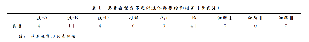患者血型經(jīng)微柱凝膠卡式法檢測,ABO、Rh血 型顯示為 正 定 型 AB 型 Rh(D)陽 性,反 定 型 為 A 型,不規(guī)則抗體篩查陰性。反應強度及格局見表1。