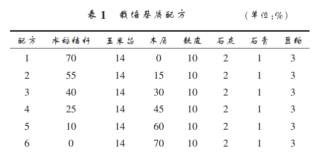 原種培養(yǎng)基采用麥粒作為培養(yǎng) 基,培養(yǎng)基配方為麥粒和麩皮(比例為 5∶1),再加入 1%的石膏。 麥粒浸泡 24 h 后,在 105 ℃高壓鍋中蒸 煮 15 min,出鍋瀝干水分后和麩皮及石膏混合,攪拌 均勻后裝入聚丙烯塑料袋,121 ℃高溫滅菌 2 h。 冷 卻后在超凈工作臺上接入母種。 生產(chǎn)培養(yǎng)基在原種成熟后開始制作, 采用水稻 秸稈為主料,以平菇栽培常用的培養(yǎng)基為基礎(chǔ),設(shè)置 6 組配方(表 1),每種配方設(shè)置 5 次重復(fù)。 拌料均勻后裝入聚丙烯菌袋,每袋裝濕料約 0.85 kg。 121 ℃高 溫滅菌 2 h。 冷卻后在超凈工作臺上接入原種。