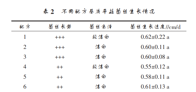 由表 2 可知,配方 1、配方 2、配方 3 的菌絲生長 勢較好,菌絲濃密,其中配方 2 和配方 3 的菌絲不但濃密而且潔白,配方 4、配方 5、配方 6 菌絲生長勢比 較濃密,且配方 5 和配方 6 的菌絲生長潔白。菌絲平 均生長速度最快的是配方 1,其次是配方 6;菌絲平 均生長速度最慢的是配方 4。 方差分析結(jié)果表明,不 同基質(zhì)的菌絲平均生長速度無顯著差異(P>0.05,下 同),說明采用水稻秸稈為主料栽培平菇對菌絲生長 無不利影響。配方 2、配方 3、配方 4 原基的 整齊度較配方 1、配方 5、配方 6 原基的整齊度好,因 此不同重復(fù)間出菇時(shí)間更接近, 利于生產(chǎn)中集中采 收。 6 種基質(zhì)的第一潮菇出菇時(shí)間從 43.4~49.8 d 不 等,其中配方 2 的第一潮出菇時(shí)間最短,配方 1 的第 一潮出菇時(shí)間最長, 第一潮出菇時(shí)間和配方中秸稈 的含量沒有線性關(guān)系; 第二潮菇出菇時(shí)間與第一潮 出菇間隔最短的為配方 3,平均約 10.0 d,間隔最長 的為配方 6,平均約 18.4 d;第三潮菇出菇時(shí)間和第 二潮菇出菇間隔最短的為配方 3, 平均約 15.3 d,最 長的為配方 5,平均約 23.8 d,從第二潮和第三潮菇 出菇時(shí)間間隔來看,隨著基質(zhì)中木屑含量的增加,間 隔時(shí)間延長, 因此基質(zhì)中木屑含量高會使平菇的生 產(chǎn)周期變長。 從出菇整齊度和出菇時(shí)間考慮, 配方 2、配方 3 比較適合平菇生產(chǎn)。平菇中主要營養(yǎng)成分為糖類 和蛋白質(zhì), 其中糖類包括可溶性糖類和不可溶的纖 維素、木聚糖,三者約占干物質(zhì)的 60%,蛋白質(zhì)約占 干物質(zhì)的 20%;干物質(zhì)中各營養(yǎng)成分的含量與配方 基質(zhì)中水稻秸稈含量都沒有線性關(guān)系, 說明利用水 稻秸稈為主料栽培平菇不會影響平菇的營養(yǎng)品質(zhì)。
