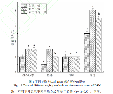 不同干燥方法對 DSN 感官評分的影響見圖 1。由圖 1 可知,真空干燥與真空冷凍干燥對 DSN 組 織狀態評分影響無顯著性差異(P>0.05),但兩者顯著大于鼓風干燥(P<0.05),這可能是由于鼓風干燥溫度較高,制得的 DSN 質地較硬,蟲體表面開裂。3 種干燥方法顯著影響 DSN 的色澤(P< 0.05),真空干燥制得的干制品色澤評分最高,這是由于真空干燥溫度適中,美拉德反應產生亮黃 色,有光澤;而鼓風干燥的高溫,使美拉德反應劇烈,肉體顏色偏重。3 種干燥方法對 DSN 的氣味 影響不顯著(P>0.05)??偡诛@示 3 種干燥方法間差異顯著(P<0.05),真空干燥的評分最高,鼓 風干燥最低。3 種干燥方法顯著影響 DSN 的復水率(P<0.05),真空冷凍干燥的復水速度與復 水率最大,真空干燥次之,鼓風干燥最小。干燥過程中樣品細胞結構的破壞程度決定了干制品的復水 性能。真空冷凍干燥制得的 DSN 表面與肌肉纖維間存在大量的孔隙,水分滲入速度快且復水率 高;金洋等的研究發現真空冷凍干燥制得烏賊的復水速度與復水率均大于自然晾曬干燥與熱風干 燥,支持了本研究結果。真空干燥與鼓風干燥由于干燥溫度相對較高,干燥過程中方格星蟲組織內的 細胞結構被破壞或錯位,且不可逆轉,進而肌肉組織收縮,結構塌陷,DSN 的復水率減??;鼓 風干燥溫度最高,制得的 DSN 內部的肌肉纖維排列致密,復水的水分難以滲入,復水率最低。