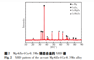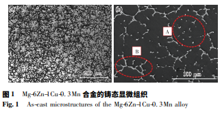 圖 1 和圖 2 分別為鑄態(tài) Mg-6Zn-1Cu-0. 3Mn 合金的顯微 組織形貌和 XRD 譜。由圖 1a 可看出,Mg-6Zn-1Cu-0. 3Mn 合 金組織由白色的等軸 α-Mg 基體和沿晶界分布的黑色共晶組 成。其中,α-Mg 基體呈“雪花”狀和“薔薇”狀,共晶組織呈孤 點狀( 圖 1b 紅圈 A 所示) 和粗大樹枝狀( 圖 1b 紅圈 B 所 示) 。由 圖 1 結(jié) 合 圖 2 可 得,共 晶 組 織 由 ( α-Mg + CuZn2 + CuMgZn+CuMnZn) 組成。在共晶組織中,因溶質(zhì)原子 Zn 含 量較高,其形成的化合物富集于枝晶邊界處,呈樹枝狀分 布; 彌散的孤立點狀相是 Mn 顆粒及其化合物( CuMnZn) 。 在非平衡凝固過程中,當溫度降至液相線溫度時會析出 α-Mg 基體,當溫度繼續(xù)降至共晶溫度點時,共晶組織( α-Mg+CuZn2 +CuMgZn+CuMnZn) 沿 α-Mg 基體邊界析出,同時剩余 的溶質(zhì)原子富集在枝晶根部。