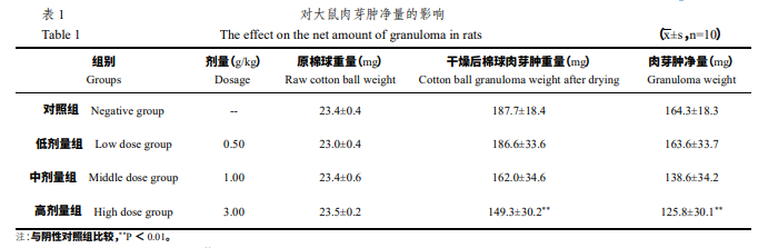 所有動(dòng)物鼠體重呈正常增長,精神狀態(tài)、行為活動(dòng)、攝食攝水、糞便、尿液以及各腔道分泌物等均未見 明顯異常。受試樣品各劑量組動(dòng)物體重與陰性對(duì)照組 比較差異無顯著性(P > 0.05)。與陰性對(duì)照組相比,受試樣品各劑量組大鼠干燥 后棉球肉芽腫重量、肉芽腫凈量均呈劑量依賴性減少, 其中高劑量組差異具有顯著性(P < 0.01),見表 1。