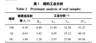 試驗樣品選用 3 種不同煤化程度的煤樣,分別 為內蒙古二連盆地褐煤( NM) 、新疆準噶爾盆地長焰煤( XJ) 和鄂爾多斯盆地韓城煙煤( HC) ,工業分 析見表 1。