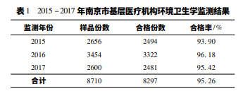2015 - 2017 年對南京市基層醫療機 構各重點科室進行常規采樣監測,二級醫療機構每年監測兩次,一級和無級別醫療機構每年監測一次。監 測地點包括手術室、ICU、新生兒室等重點科室。監 測項目為室內空氣、醫務人員手、物體表面、使用中 消毒液、壓力蒸汽滅菌器(上海博迅醫療生物儀器股份有限公司提供)滅菌效果、紫外線燈、醫療器材、污 水。3 年共計采集樣品 8 710 份。