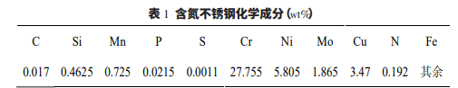 采用 316L 不銹鋼、鉬鐵、Ni 板、金屬 Cr 和氮化鐵 等原材料,在中頻感應(yīng)爐中熔煉,澆注后試樣的化學(xué)成份 如表 1 所示。