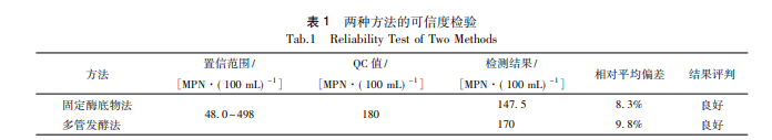 固定酶底物法、多管發酵法 3 次測定質控樣品的平 均 值 分 別 為 147. 5 MPN/( 100 mL ) 和 170 MPN/( 100 mL) ,相 對 平 均 偏 差 分 別 為 8. 3% 和 9. 85%,精密度良好。兩種方法檢測結果均在質控 樣品置信范圍內[48. 0~498 MPN/( 100 mL) ],接近 質控樣品標準值[180 MPN/( 100 mL) ],檢測結果 可信度良好( 表 1) 。