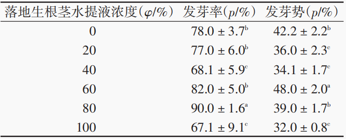表1 落地生根莖水提液對穿心蓮種子萌發的影響