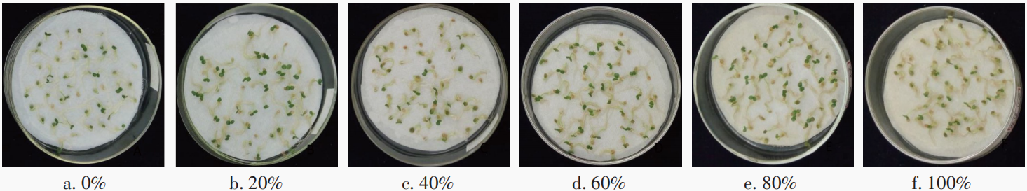 不同濃度落地生根浸提液處理穿心蓮種子2d后,結果見表1、圖1。20%處理組和60%處理組的種子發芽率與0%對照組無顯著性差異,但60%處理組的發芽率為82%,顯著高于40%處理組(P<0.05),可促進穿心蓮種子在發芽周期的前2d內萌發。80%處理組的發芽率為90%,比0%對照組高出的12%(P<0.05),可促進穿心蓮種子萌發,提高種子發芽率。40%處理組和100%處理組與對照組相比,均對穿心蓮種子的發芽率呈顯著抑制作用。另外,由表1可知,60%處理組可提高發芽勢,其他處理組均抑制發芽勢。表明濃度為60%~80%處理組的落地生根莖水提液間可促進穿心蓮種子萌發,促進發芽率和發芽勢,且效果顯著。