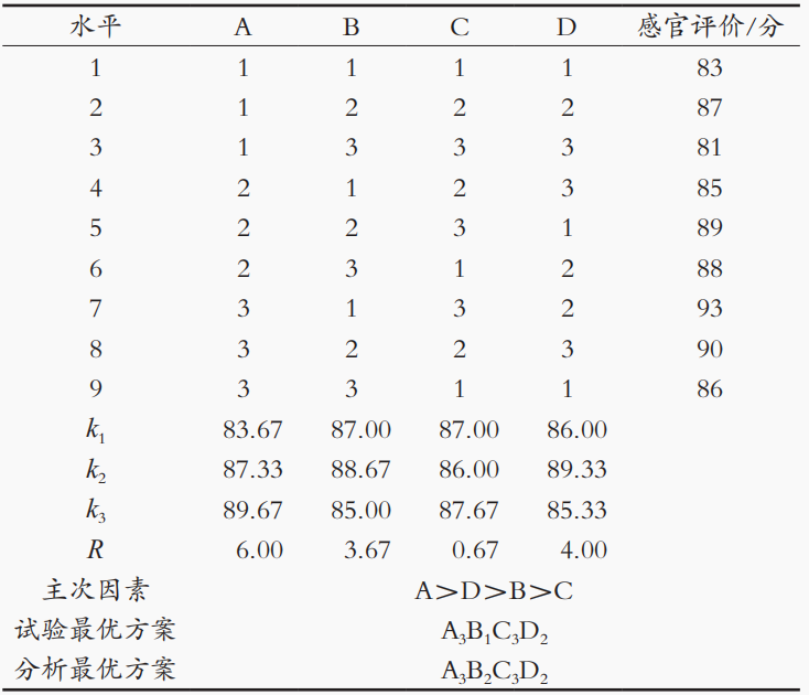保健飲料口感調配優化正交試驗,結果見表1。復合保健茶飲料最優調配方案為A3B2C3D2,即發酵液15%、白果汁10%、蔗糖7%、綠茶16%,根據極差分析,各因素對飲料感官影響程度的主次順序是A>D>B>C,即發酵液>綠茶汁>白果汁>蔗糖。按最優方案調配復合茶飲料,進行感官評定,感官綜合評價為94分。復合茶飲料呈淺黃色,酸甜適中,具有靈芝、杏鮑菇、白果汁、牛蒡和菊花特有的復合香氣與滋味,營養豐富、功效齊全。